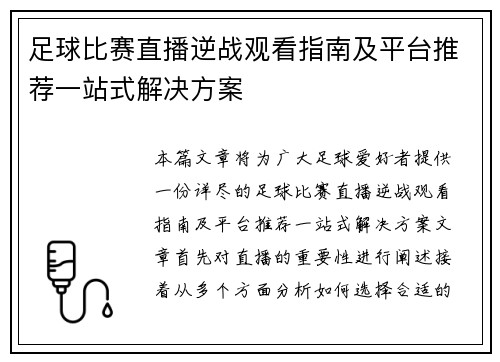 足球比赛直播逆战观看指南及平台推荐一站式解决方案
