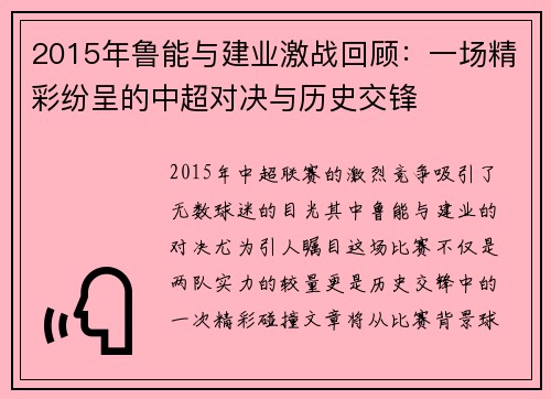 2015年鲁能与建业激战回顾:一场精彩纷呈的中超对决与历史交锋